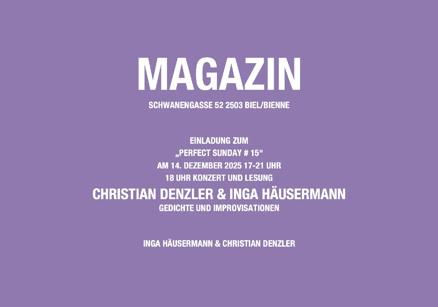 MAGAZIN Schwanengasse 52,Biel/Bienne,SwitzerlandPERFECT SUNDAY 12 Musikalische Lesung mit Kollekte 18 Uhr CHRISTIAN [...]